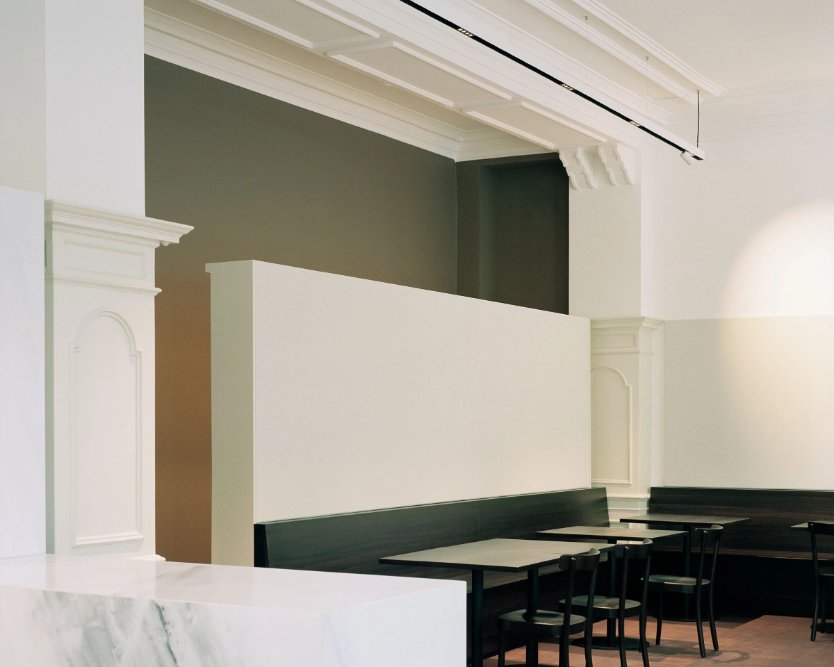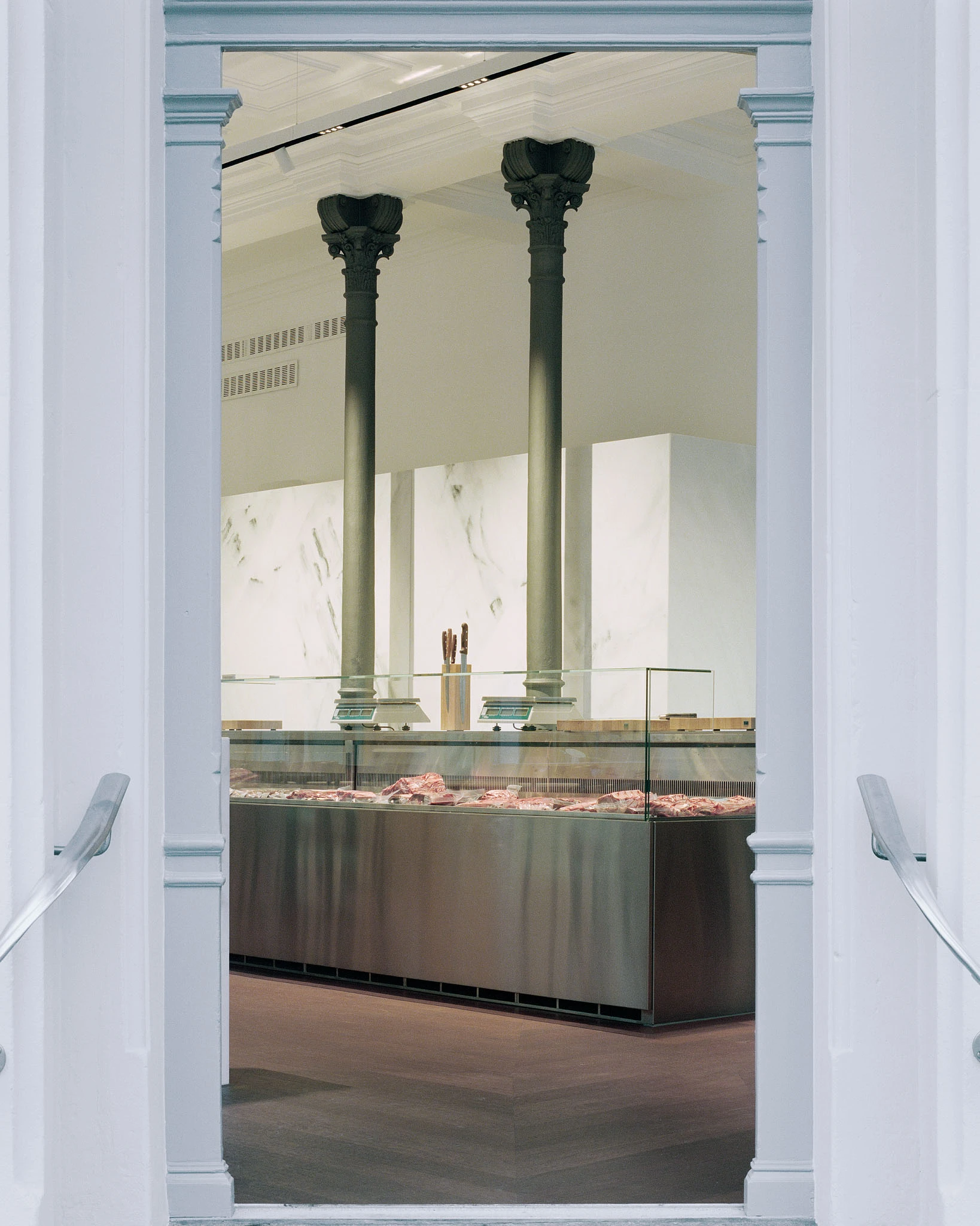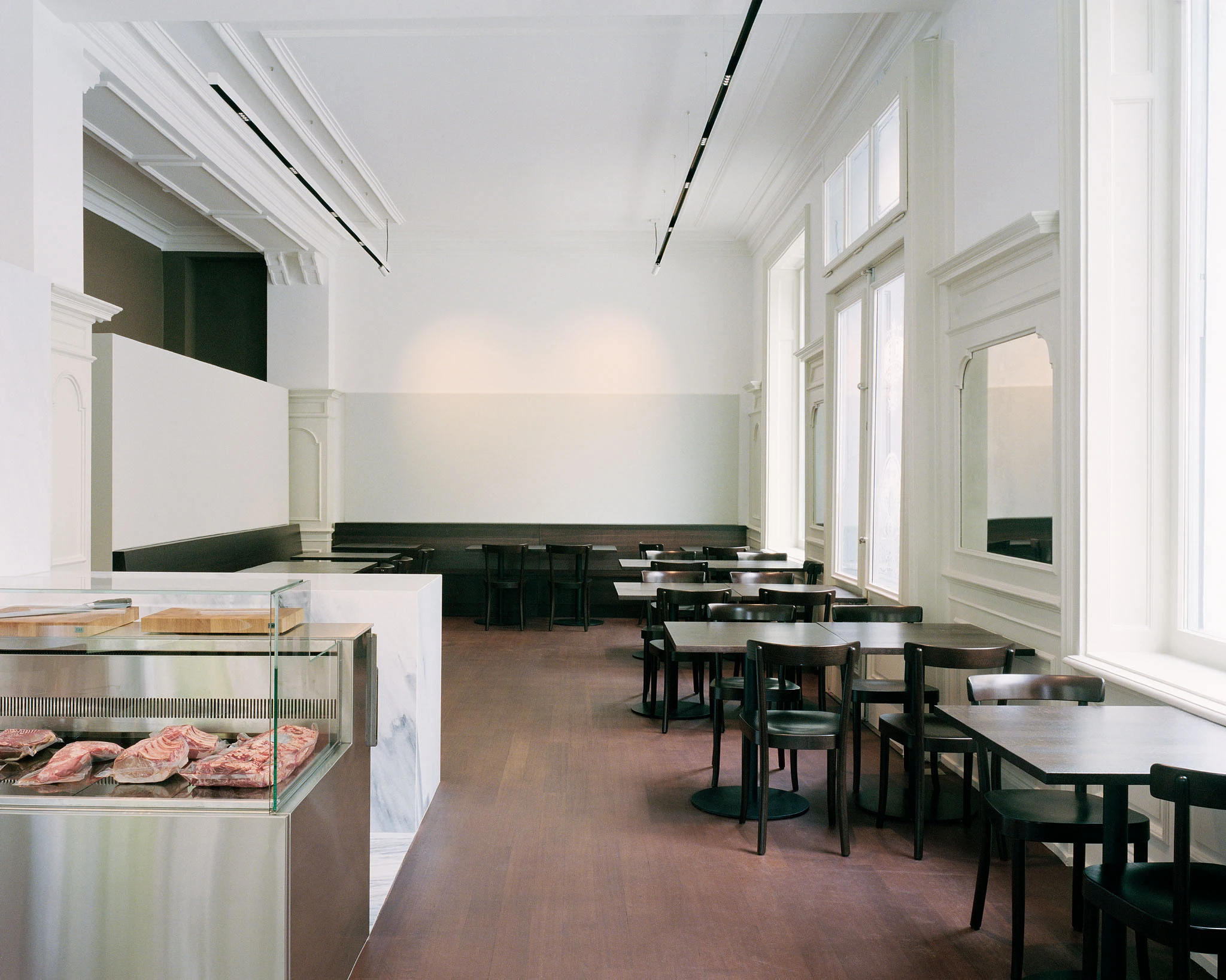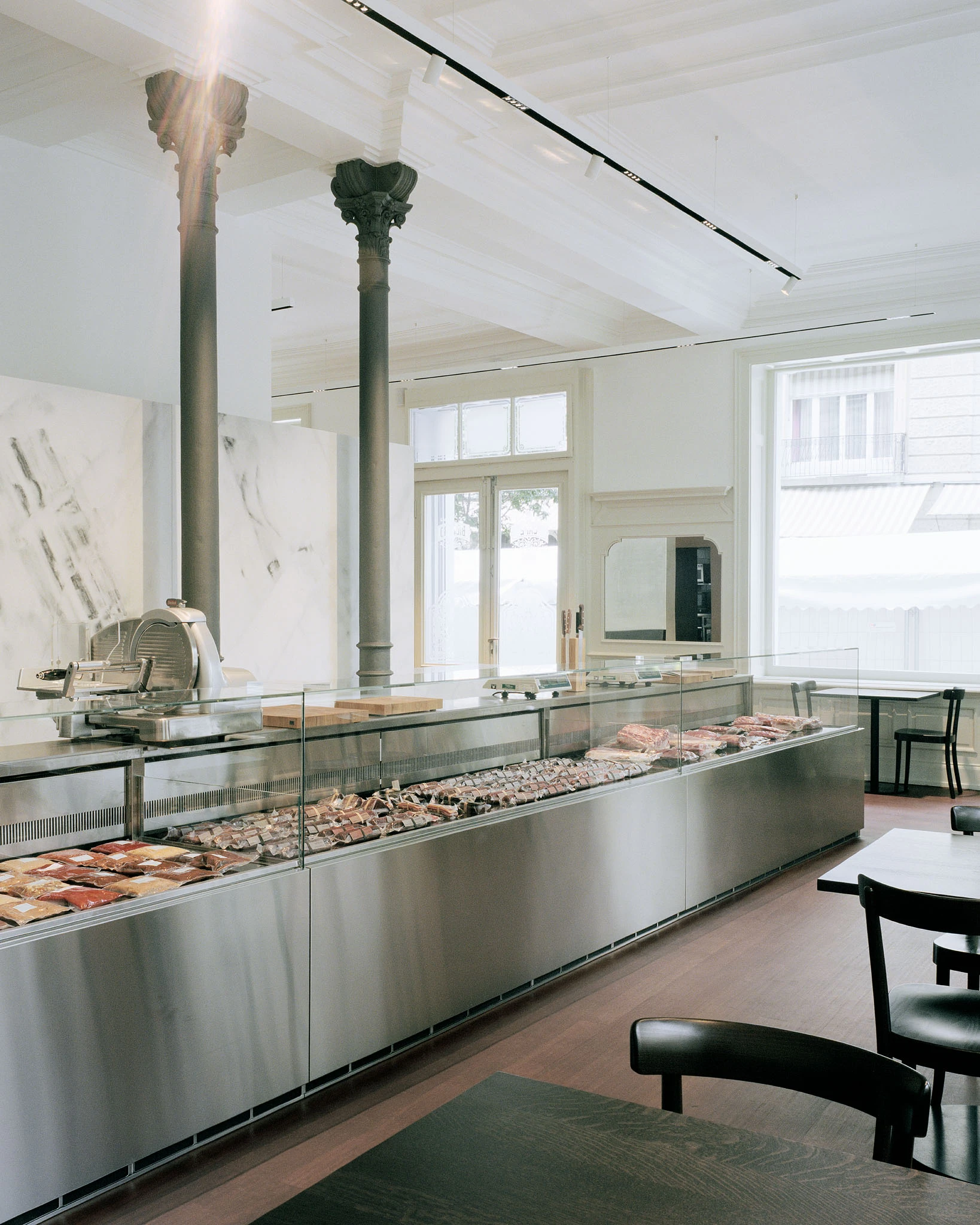 In einem ersten Schritt werden alle gestalterisch überflüssigen Elemente des Restaurantausbaus der letzten Jahrzehnte wie Windfang, massive Bartheke, Beleuchtungselemente, Vorhänge, Regale, Dekorationen etc. entfernt, so dass die historische lineare Ornamentik der Gipsdecke und der Wandvertäfelung mit Architekturgesimsen wieder zur Geltung kommt. Der L-förmige Saal wird durch die neue Leere für den Überblick des eintretenden Besuchers geeint. Im Schwerpunkt befindet sich nun eine Kühltheke, gefüllt mit diversen Fleischprodukten, und die sieben Meter lange Arbeitsfläche aus Chromstahl: Es ist vor allem eine Metzgerei, die nebenan Platz für den Verzehr von Fleischgerichten am Tisch bietet. Die raumhaltige Rückwand hinter der Metzgertheke fungiert als subtiler Filter zwischen Küche und Metzgerei. Weisser Marmor aus Lasa (Südtirol) verkleidet nicht nur dieses Element, sondern markiert auch klar die Grenze zwischen dem Arbeits- und dem Gästebereich. Alte und neue Raumelemente (dezentes Beleuchtungssystem, textile Akustikflächen) erscheinen in unterschiedlichen Weisstönen. Hingegen bilden die dunkel geölten und lasierten Holzoberflächen und die lackierten «Schuppenpanzer» der Metallstützen einen spannungsvollen Kontrast dazu.