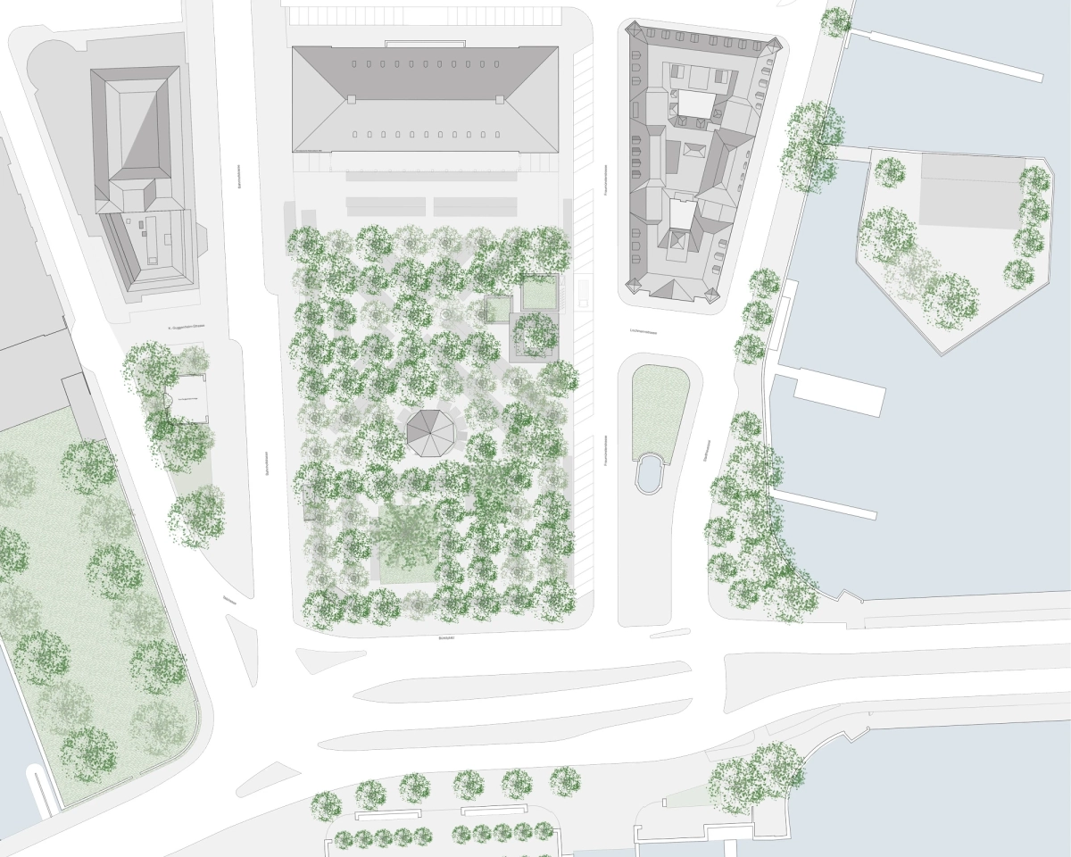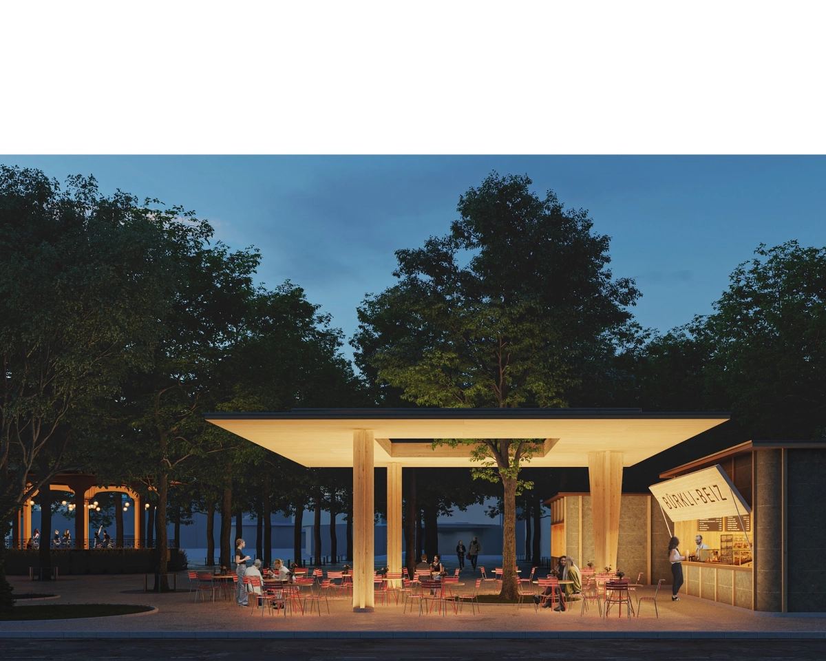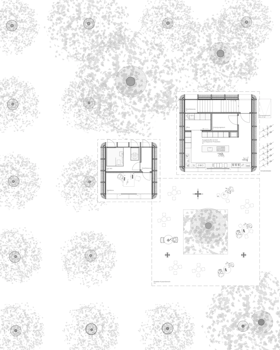 Der Entwurf positioniert sich am östlichen Rand des Parks und vereint das Raumprogramm in drei zueinander proportionierten, quadratischen Baukörpern zusammen. Die ersten beiden Volumen, der Marktpavillon mit öffentlichen Toiletten und das Buffet, sind bewusst nicht im Baumraster angeordnet, sondern leicht versetzt, um sich den Hauptnutzungen wie Marktbetrieb und anderen Veranstaltungen unterzuordnen. Erst durch diese Positionierung wird der Park konsequent durchlässig umgestaltet, da sich die Baukörper nicht mehr zu einer bestimmten Seite hin orientieren. Es entsteht keine Vorder- und Rückseite des Parks. Das dritte Volumen, ein grosszügig gestaltetes, freistehendes Dach, wird zum zentralen Element des Trios und bindet es – durch seine rasterförmig angeordneten Stützen – souverän und diskret in die Gesamtanlage ein.