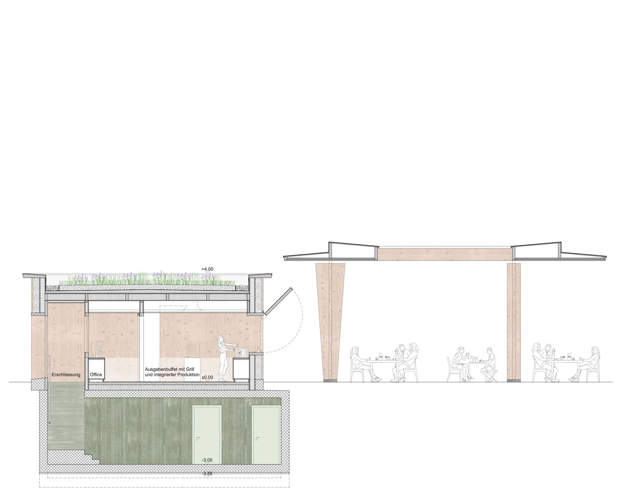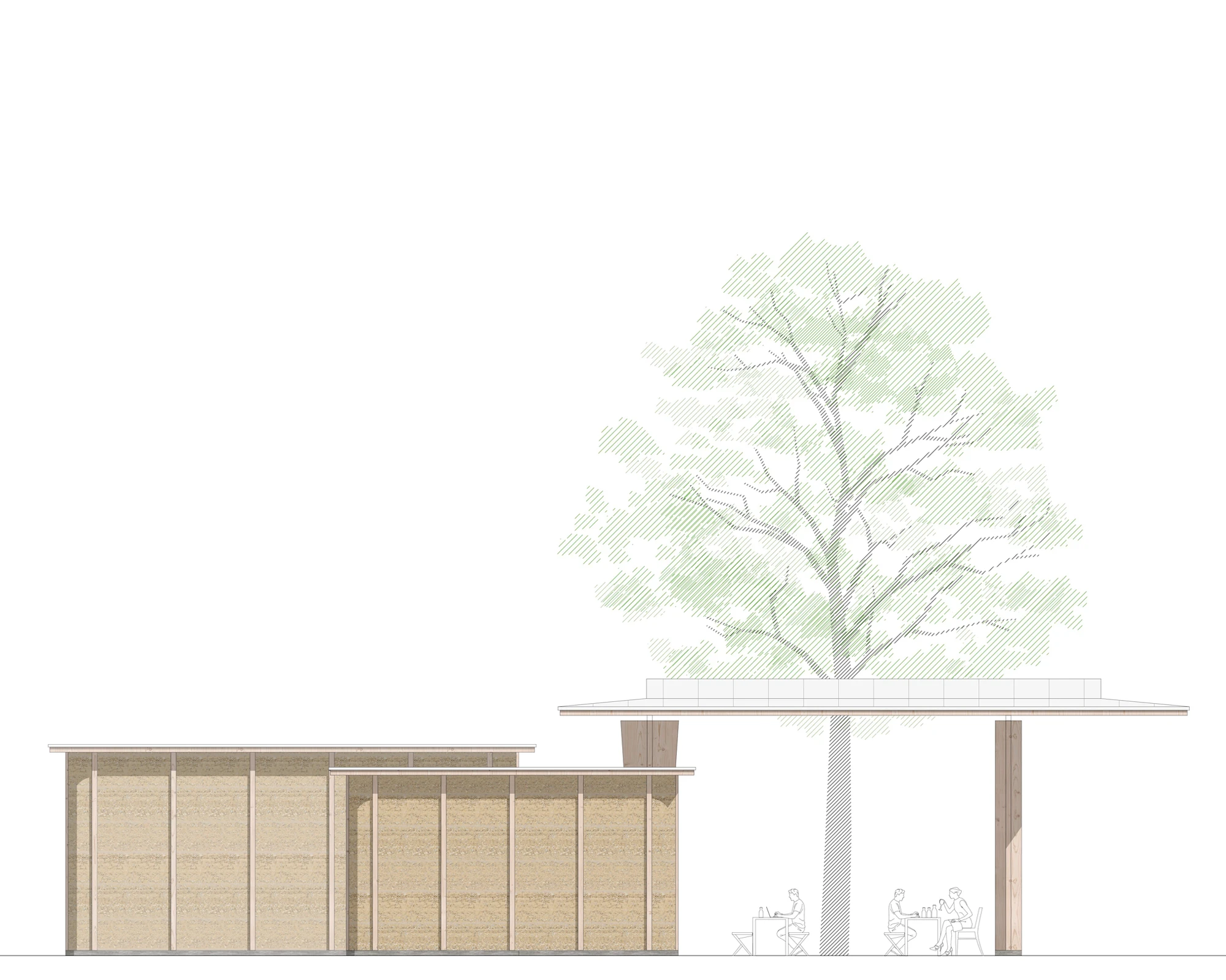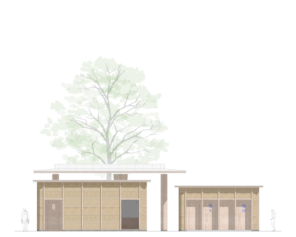 Der Entwurf positioniert sich am östlichen Rand des Parks und vereint das Raumprogramm in drei zueinander proportionierten, quadratischen Baukörpern zusammen. Die ersten beiden Volumen, der Marktpavillon mit öffentlichen Toiletten und das Buffet, sind bewusst nicht im Baumraster angeordnet, sondern leicht versetzt, um sich den Hauptnutzungen wie Marktbetrieb und anderen Veranstaltungen unterzuordnen. Erst durch diese Positionierung wird der Park konsequent durchlässig umgestaltet, da sich die Baukörper nicht mehr zu einer bestimmten Seite hin orientieren. Es entsteht keine Vorder- und Rückseite des Parks. Das dritte Volumen, ein grosszügig gestaltetes, freistehendes Dach, wird zum zentralen Element des Trios und bindet es – durch seine rasterförmig angeordneten Stützen – souverän und diskret in die Gesamtanlage ein.