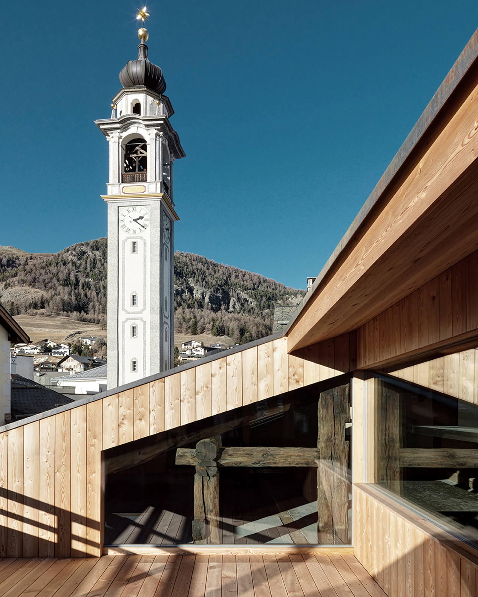 Einige Patrizierhäuser im Engadin erzählen mit ihrer jahrhundertealten Materialsubstanz (Stein, Holz, Mörtel) von der Geschichte und den Lebensformen von Generationen von Familien. Im guten Fall erweitert und bereichert jede Generation das bauliche Erbe. Der Dachstock der Chesa Lazzarini mit seinen uralten schwarzen Holzbalken, Pfetten und Sparren diente früher als ärmliche, unbeheizte Schlafstätte für die Dienstboten und als Lagerraum.