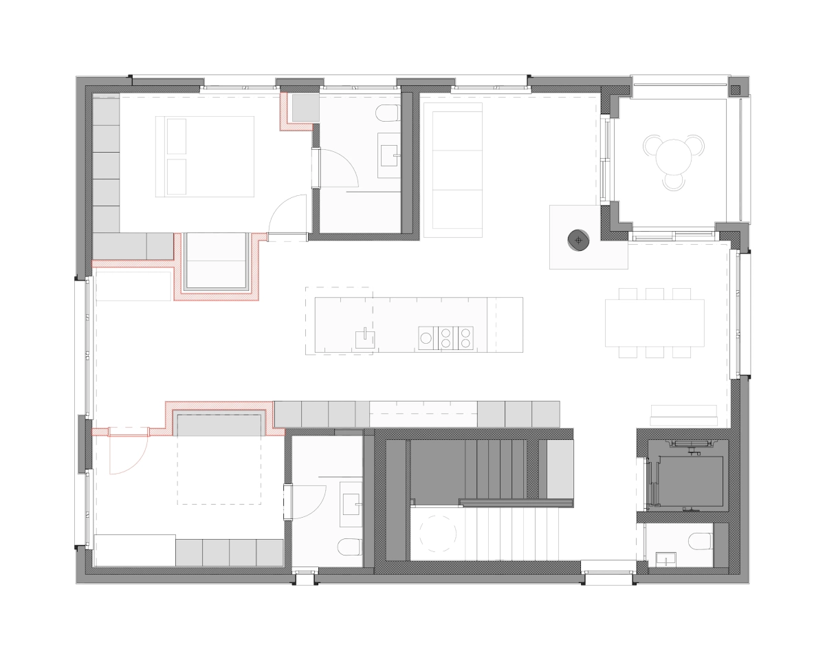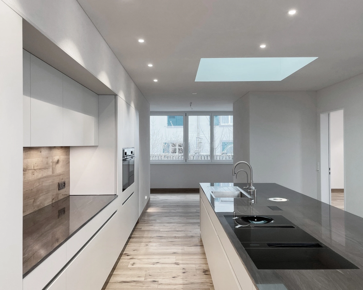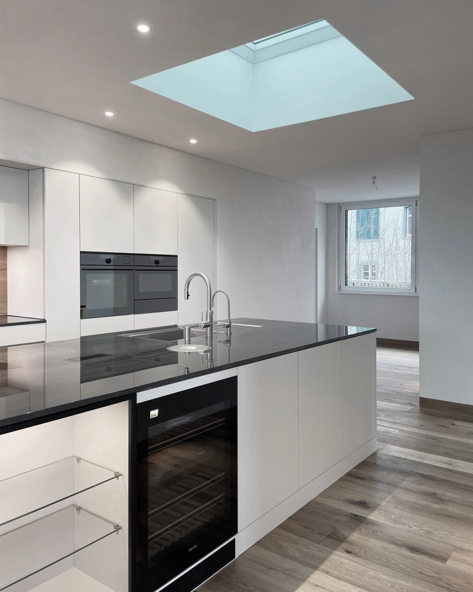Während der Rohbauphase von drei neuen Mehrfamilienhäusern an der Felsenstrasse im Zentrum von St. Gallen bat Dr. Roza um Beratung und Planungsunterstützung für den Ausbau seiner Attikawohnung. Um eine optimale Raumaufteilung zu schaffen, die seinem Lebensstil entspricht, mussten Wände versetzt sowie neue Nischen und Stürze eingebaut werden. Auch bei der anspruchsvollen Festlegung der Oberflächenmaterialien und deren Anschlussdetails war die Unterstützung eines Architekten gefragt.