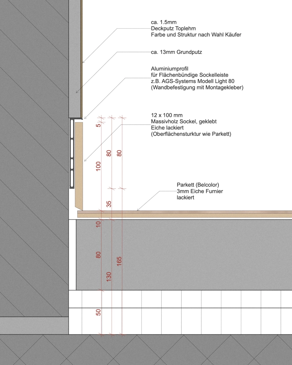 Das Haus und der dazugehörige Wohnkomplex wurden nach kommerziellen Baustandards entworfen. Gleichzeitig sind die Mittel für eine individuelle Gestaltung begrenzt. Als Antwort auf die eingeschränkte Ausgangssituation werden die Räume auf das Wesentliche für den Nutzer umstrukturiert. Der Bauherr legt viel Wert auf eine naturnahe Lebesweise, wonach sich die Raumgestaltung mit natürlichen Materialien orientiert. So bilden schwarz-grauer Basalt (Abdeckung Arbeitsflächen der Küche), Lehm- und Kalkputze sowie ein in die Wandfläche eingelassener Massivholzsockel aus Eiche die «dritte Haut» des anspruchsvollen Bauherrn.