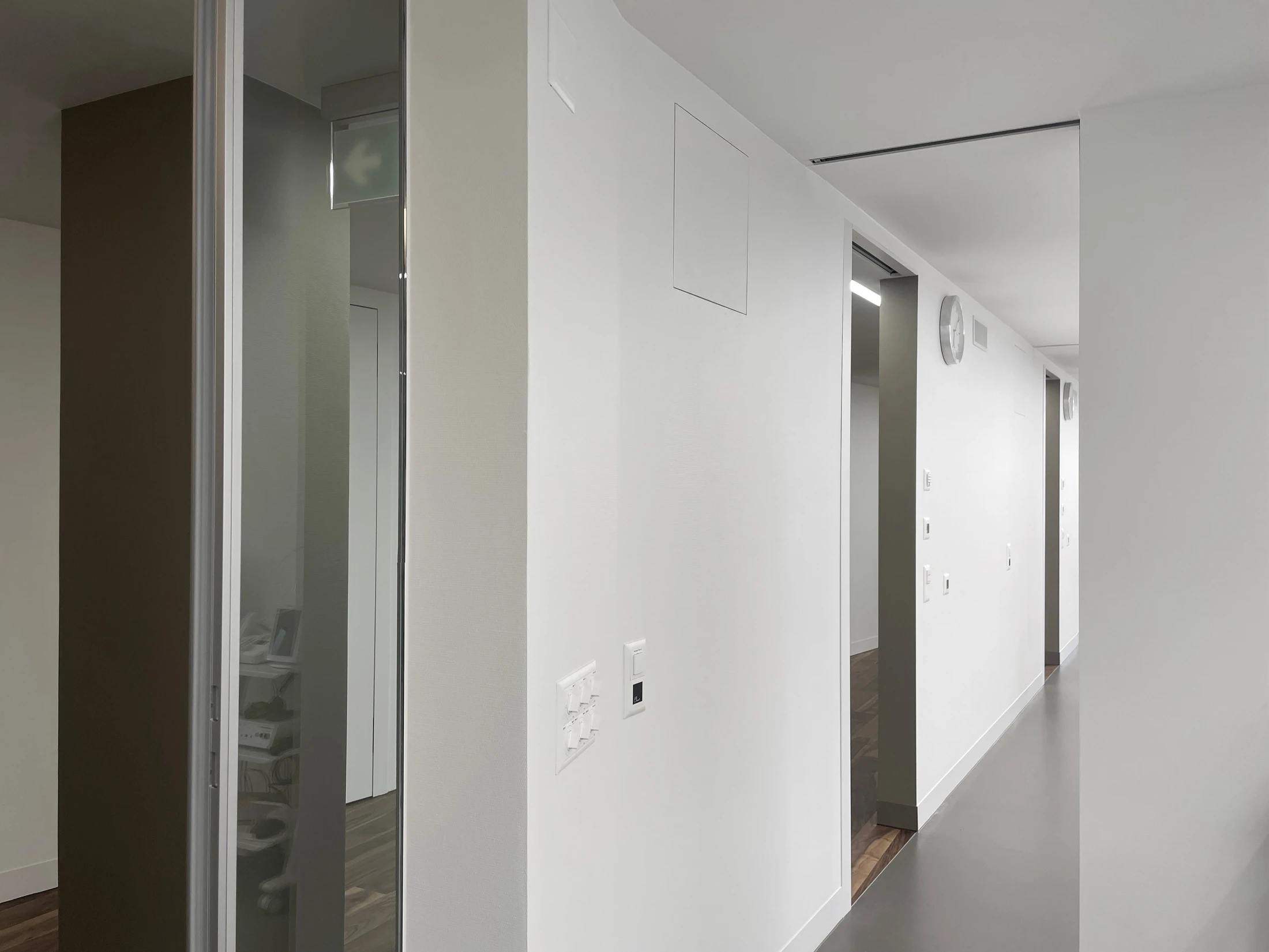 Die vorhandene Raumstruktur lässt sich gut erweitern. Die vom orthogonalen Gebäuderaster abweichenden Flurwände erzeugen eine subtile Dynamik: Auf dem Weg zu den Behandlungsräumen fühlt man sich eingeladen und nimmt unbewusst das Wechselspiel von weiten und engen Raumsituationen wahr. Mit den dunklen Wandflächen wirkt diese Raumfolge wie eine abstrahierte Höhle, hinter deren Öffnungen mit Glasschiebetüren der lichtdurchflutete Technikbereich der Zahnmedizin zum Eintreten lockt. Die Behandlungszimmer sind nach dem Stützenraster des Bürogebäude zugeschnitten und sind mit einem versteckten Sterilkorridor miteinander verbunden. Dieser Korridor, der der leichten Abwinklung des Flurs folgt, ist das architektonische Herzstück des Bauwerks.