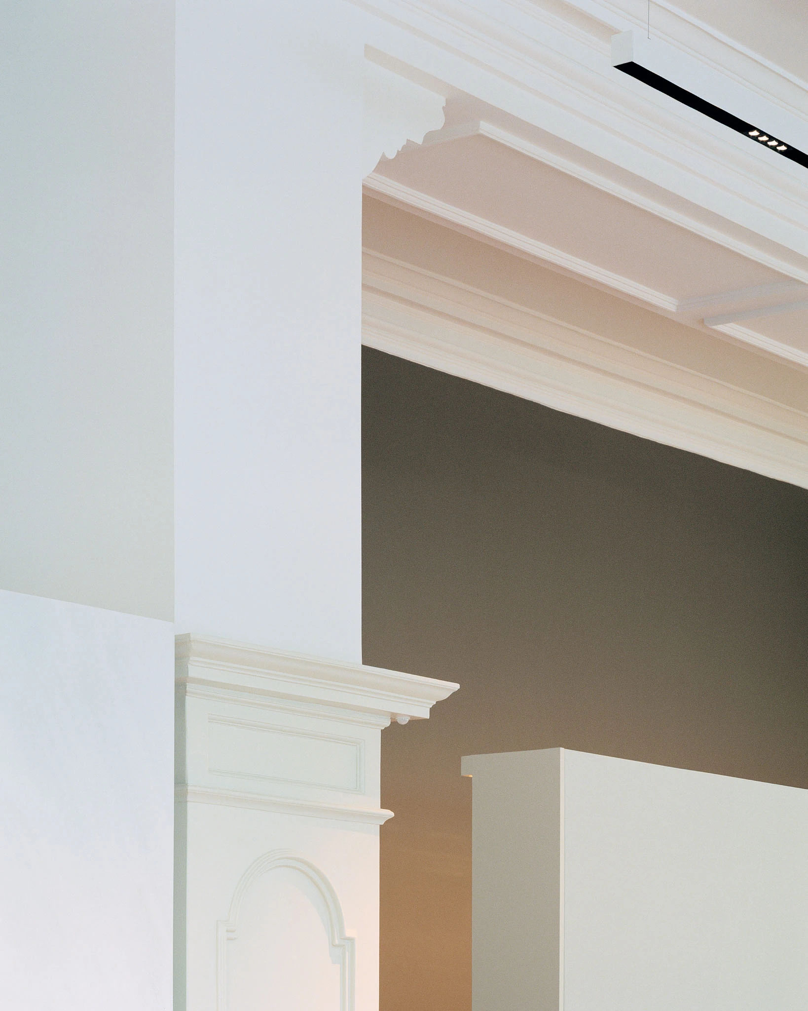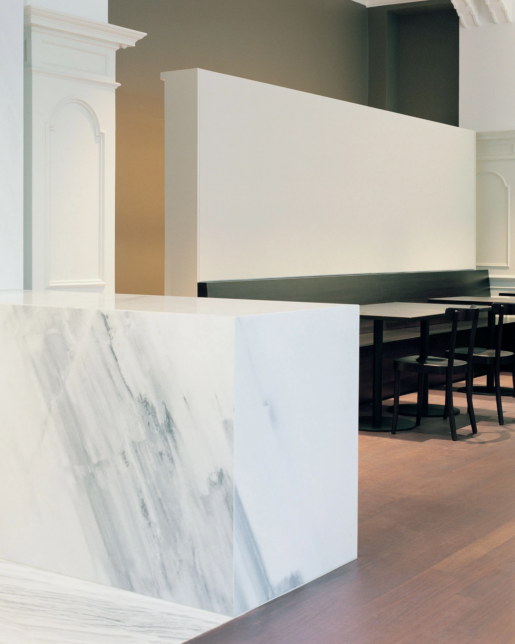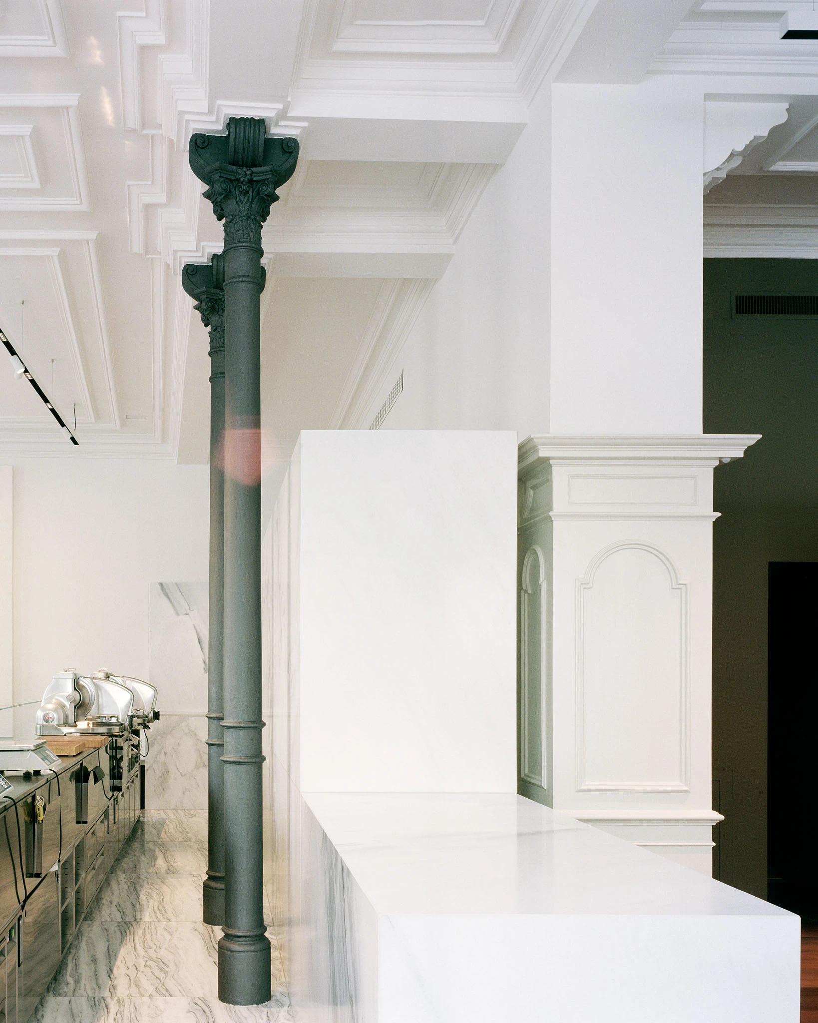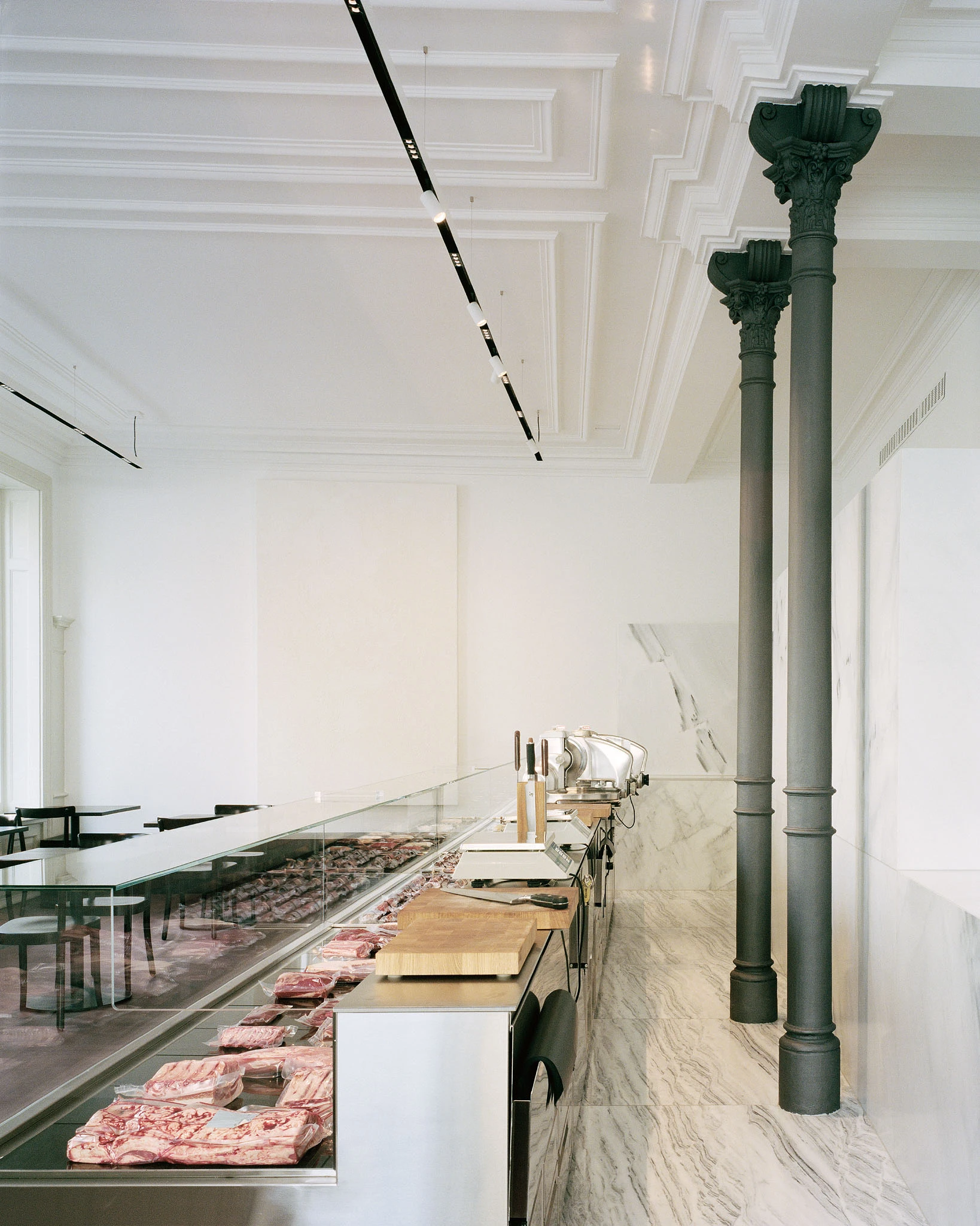 In einem ersten Schritt werden alle gestalterisch überflüssigen Elemente des Restaurantausbaus der letzten Jahrzehnte wie Windfang, massive Bartheke, Beleuchtungselemente, Vorhänge, Regale, Dekorationen etc. entfernt, so dass die historische lineare Ornamentik der Gipsdecke und der Wandvertäfelung mit Architekturgesimsen wieder zur Geltung kommt. Der L-förmige Saal wird durch die neue Leere für den Überblick des eintretenden Besuchers geeint. Im Schwerpunkt befindet sich nun eine Kühltheke, gefüllt mit diversen Fleischprodukten, und die sieben Meter lange Arbeitsfläche aus Chromstahl: Es ist vor allem eine Metzgerei, die nebenan Platz für den Verzehr von Fleischgerichten am Tisch bietet. Die raumhaltige Rückwand hinter der Metzgertheke fungiert als subtiler Filter zwischen Küche und Metzgerei. Weisser Marmor aus Lasa (Südtirol) verkleidet nicht nur dieses Element, sondern markiert auch klar die Grenze zwischen dem Arbeits- und dem Gästebereich. Alte und neue Raumelemente (dezentes Beleuchtungssystem, textile Akustikflächen) erscheinen in unterschiedlichen Weisstönen. Hingegen bilden die dunkel geölten und lasierten Holzoberflächen und die lackierten «Schuppenpanzer» der Metallstützen einen spannungsvollen Kontrast dazu.