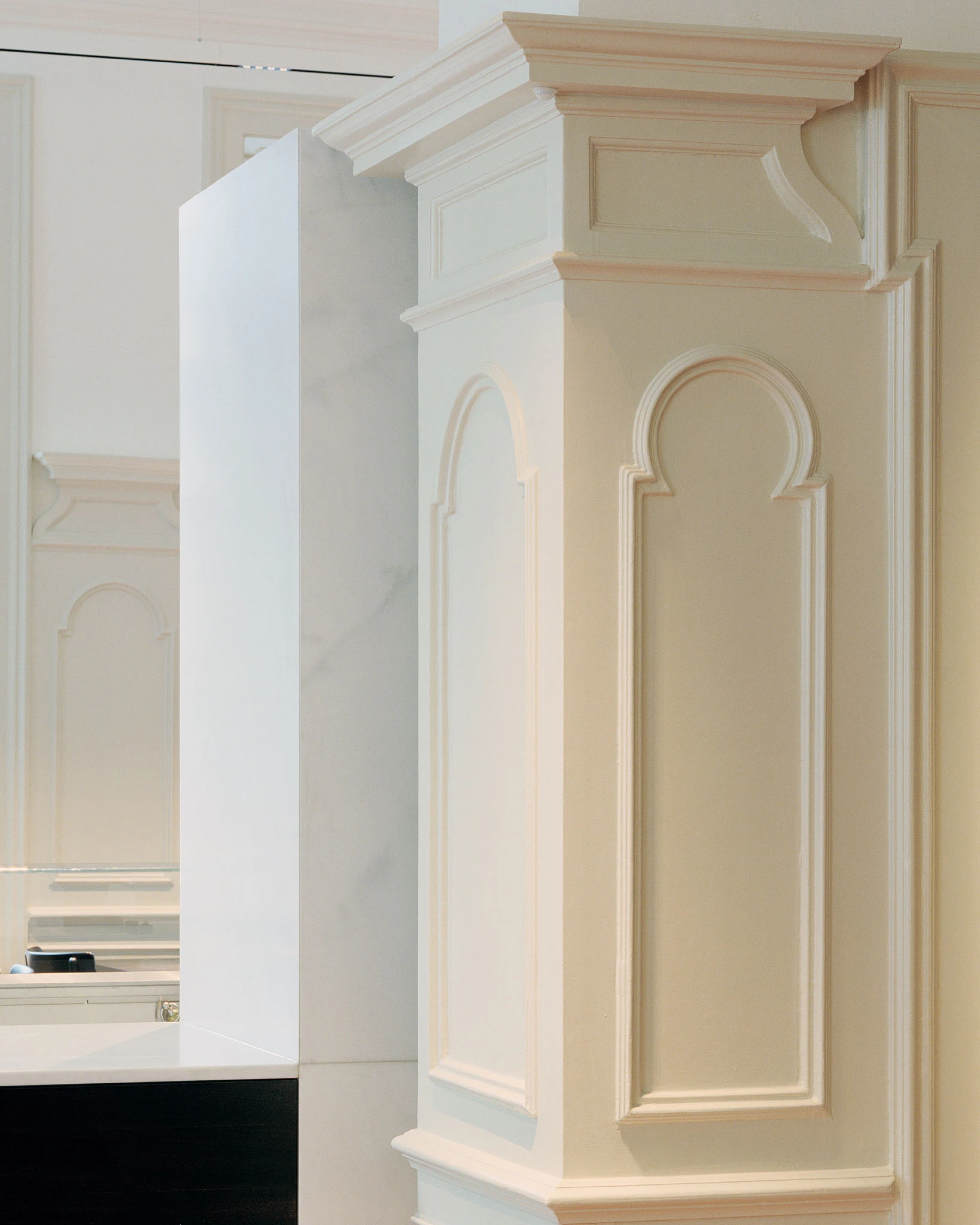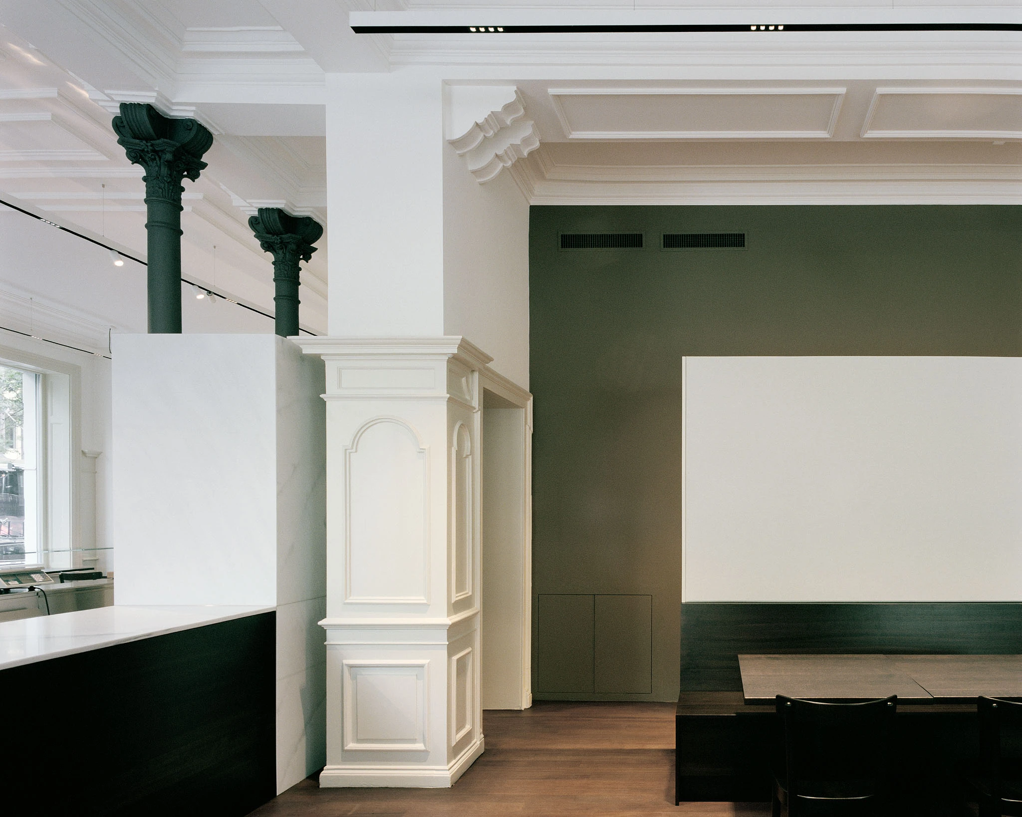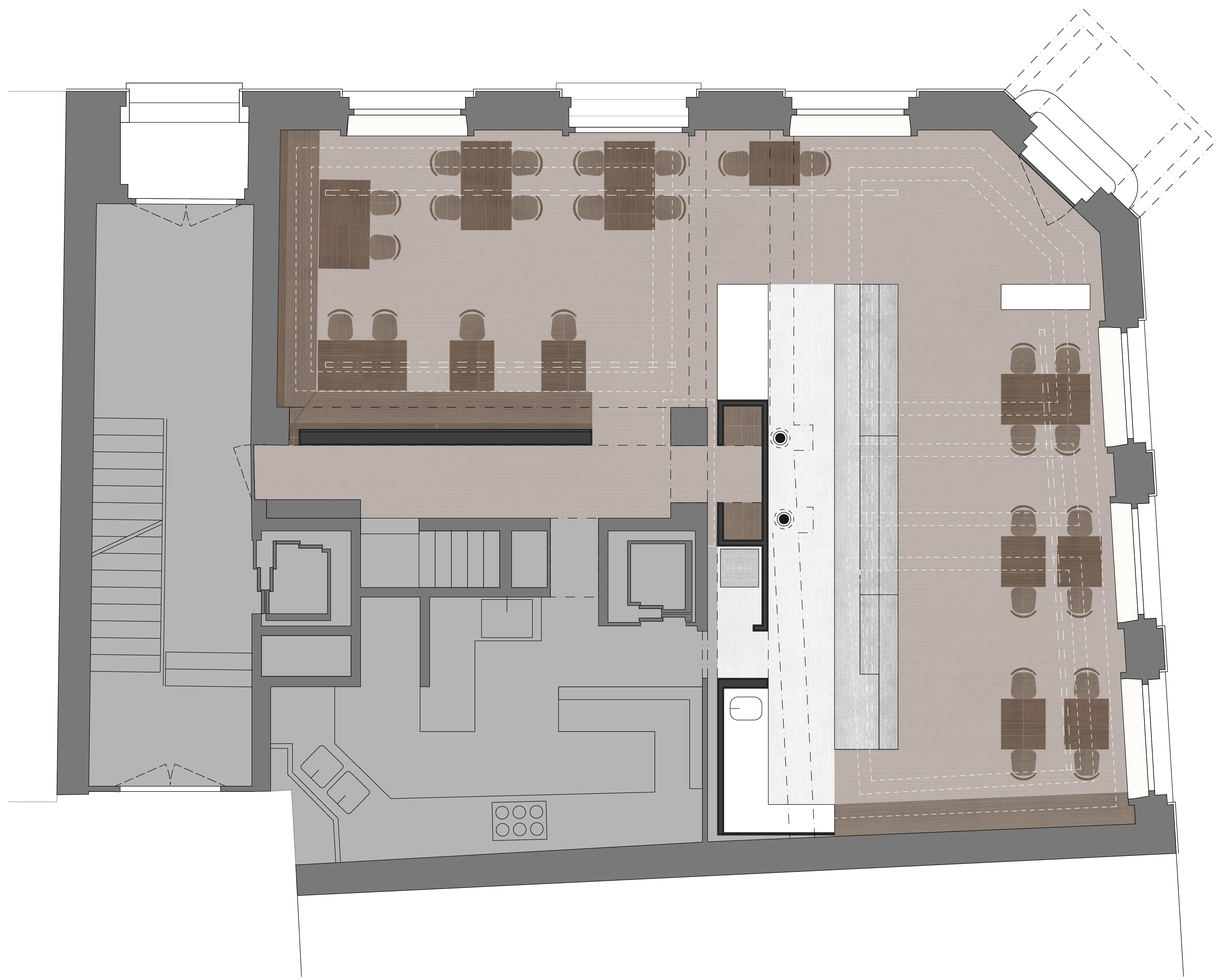 Die 2017 fertiggestellte Bar-Boucherie Hatecke an der Usteristrasse in Zürich hat sich in den letzten Jahren bei vielen Kunden, welche die Engadiner Spezialitäten von Frischfleisch bis Trockenfleisch schätzen, grosser Beliebtheit erfreut. Dem Konzept folgend, die Metzgerei als Laden und Restaurant zu kombinieren, erweitert die Familie Hatecke ihr Angebot am neuen Standort an der Dufourstrasse im Seefeld. Im historischen Haus bzw. dessen ortsbildgeschützten Speisesaal «du Theatre» sollte eine edle, zeitgemässe Bar-Boucherie mit möglichst wenigen Eingriffen in die bestehende Architektur konzipiert werden.
