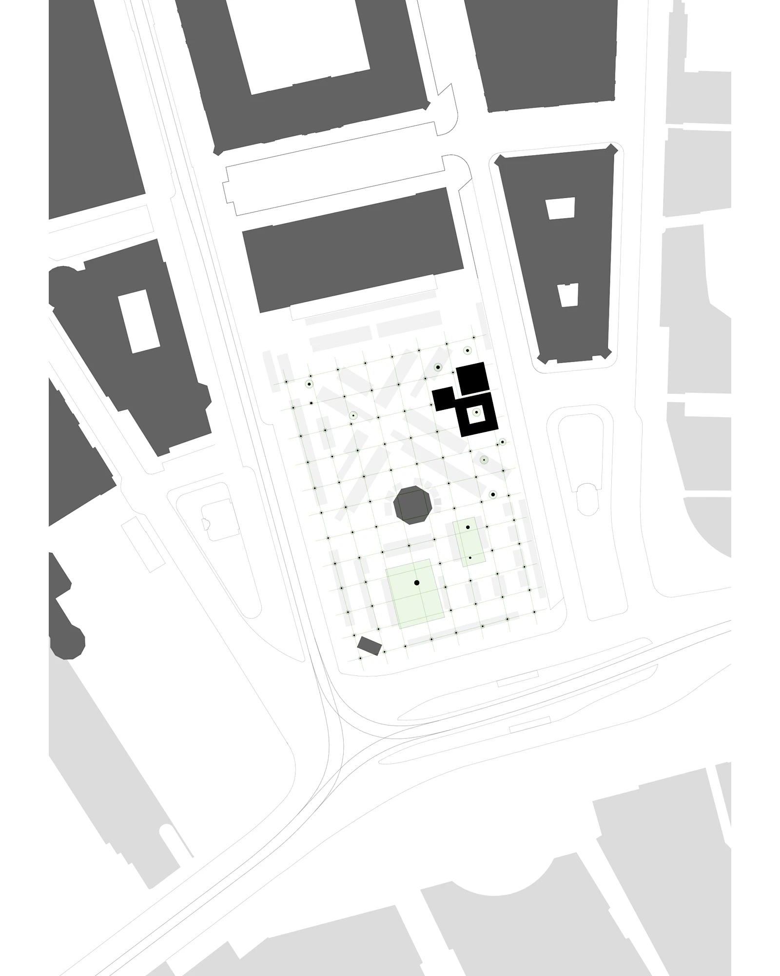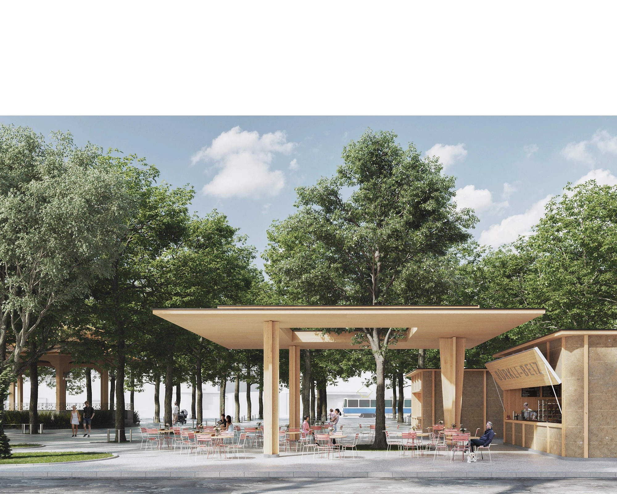 Der Entwurf positioniert sich am östlichen Rand des Parks und vereint das Raumprogramm in drei zueinander proportionierten, quadratischen Baukörpern zusammen. Die ersten beiden Volumen, der Marktpavillon mit öffentlichen Toiletten und das Buffet, sind bewusst nicht im Baumraster angeordnet, sondern leicht versetzt, um sich den Hauptnutzungen wie Marktbetrieb und anderen Veranstaltungen unterzuordnen. Erst durch diese Positionierung wird der Park konsequent durchlässig umgestaltet, da sich die Baukörper nicht mehr zu einer bestimmten Seite hin orientieren. Es entsteht keine Vorder- und Rückseite des Parks. Das dritte Volumen, ein grosszügig gestaltetes, freistehendes Dach, wird zum zentralen Element des Trios und bindet es – durch seine rasterförmig angeordneten Stützen – souverän und diskret in die Gesamtanlage ein.