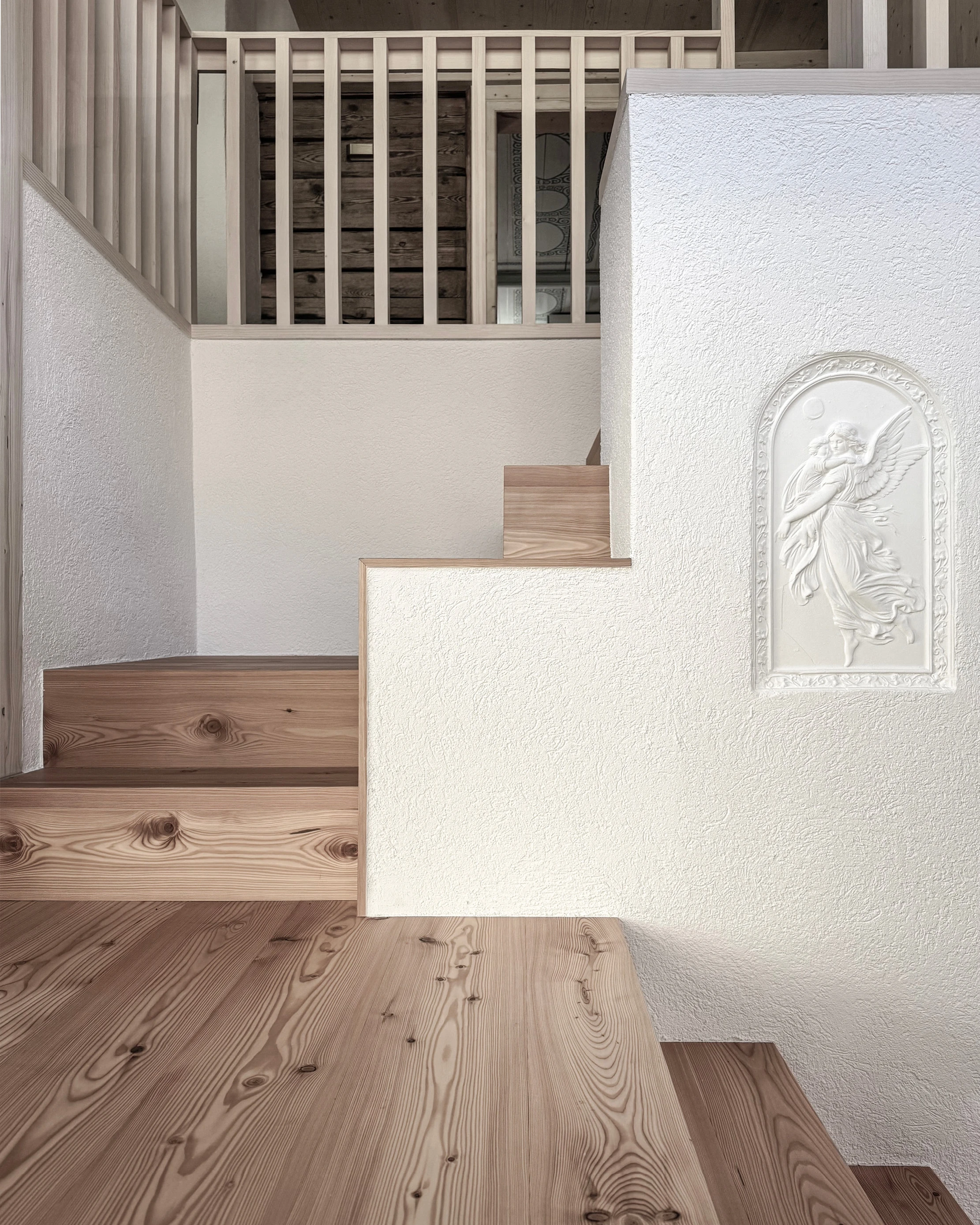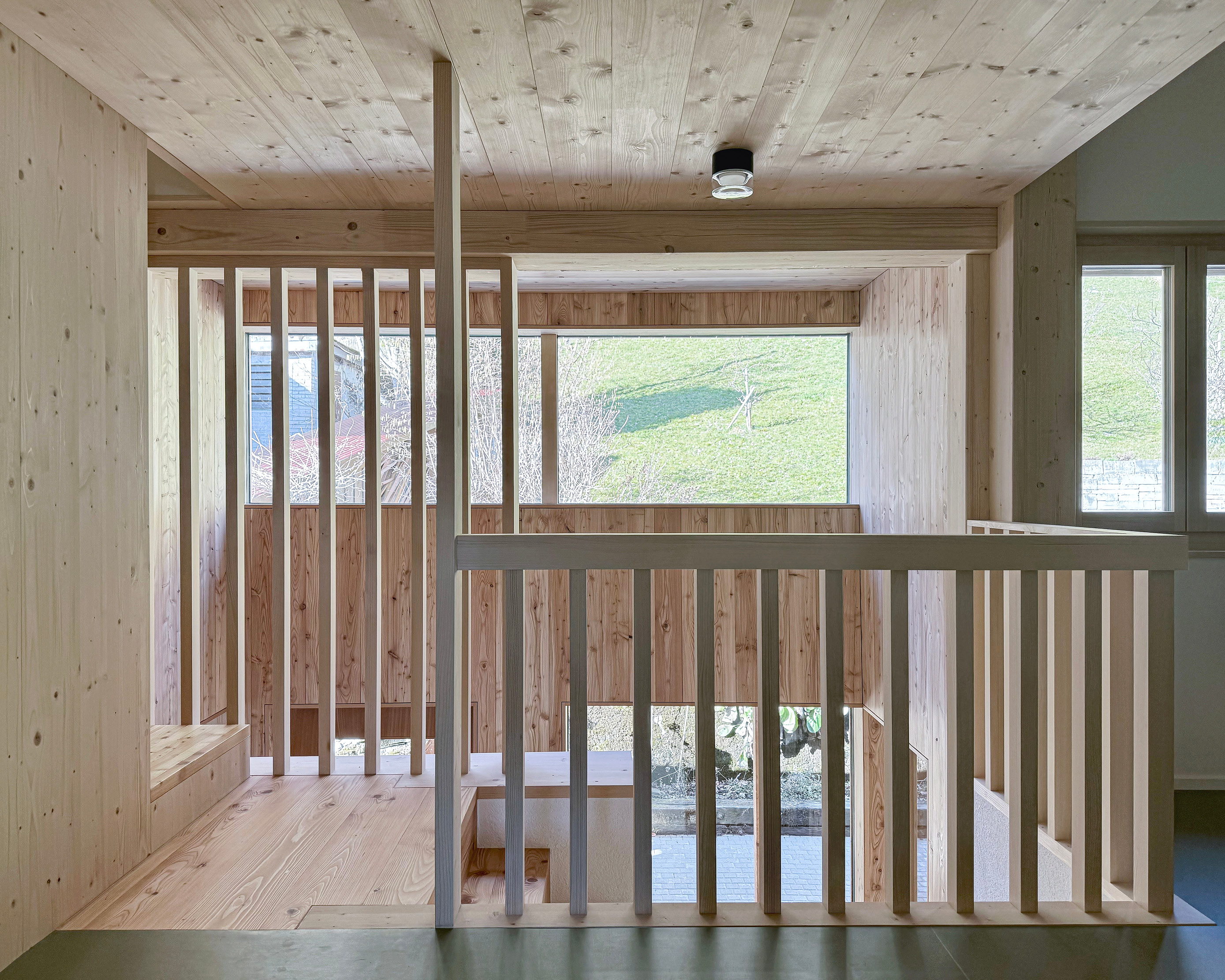 Da das Budget begrenzt war, konzentrierten sich die Eingriffe auf das Wesentliche: Jede Massnahme musste einen klaren Zweck erfüllen. Entsprechend lag der Fokus zuerst auf dem Rückbau einengender und störender Elemente. Dabei wurden überraschende Reserven freigelegt. Anstelle der ehemaligen Zwischendecke entstand ein offener Treppenraum, ergänzt durch eine darüberliegende Galerie in direktem Bezug dazu. So entwickelte sich eine helle, verbindende Offenheit – als Gegenstück zur früheren kleinteiligen Struktur. Das Ergebnis bleibt bewusst vielschichtig: Bestehende und neue Elemente stehen gleichwertig nebeneinander, Substanzielles neben emotional Bedeutsamem. Daraus entsteht ein heterogenes Gefüge, das sich nicht eindeutig ordnen lässt – und sich einfachen Vorstellungen von „schön“ oder „unschön“ entzieht.