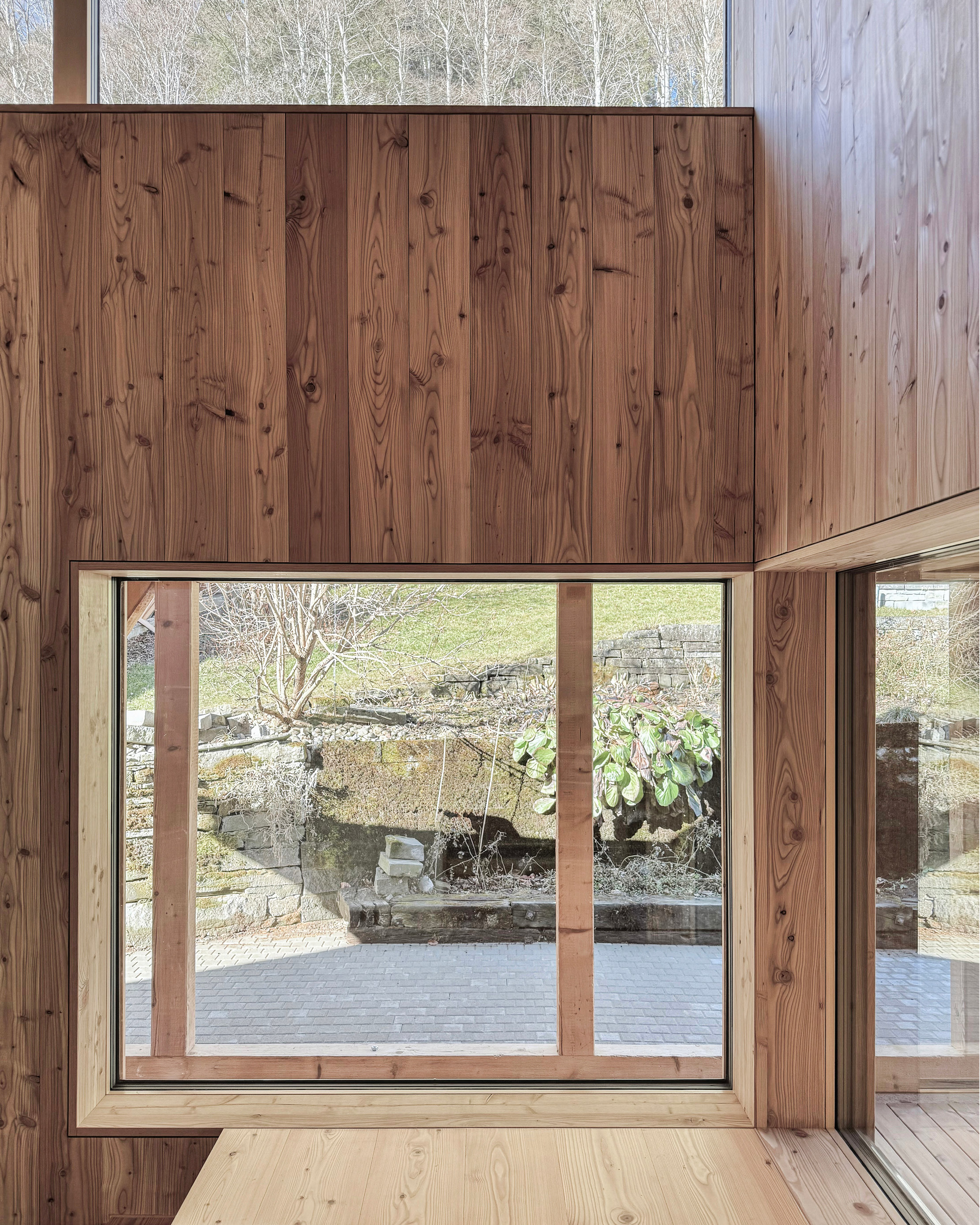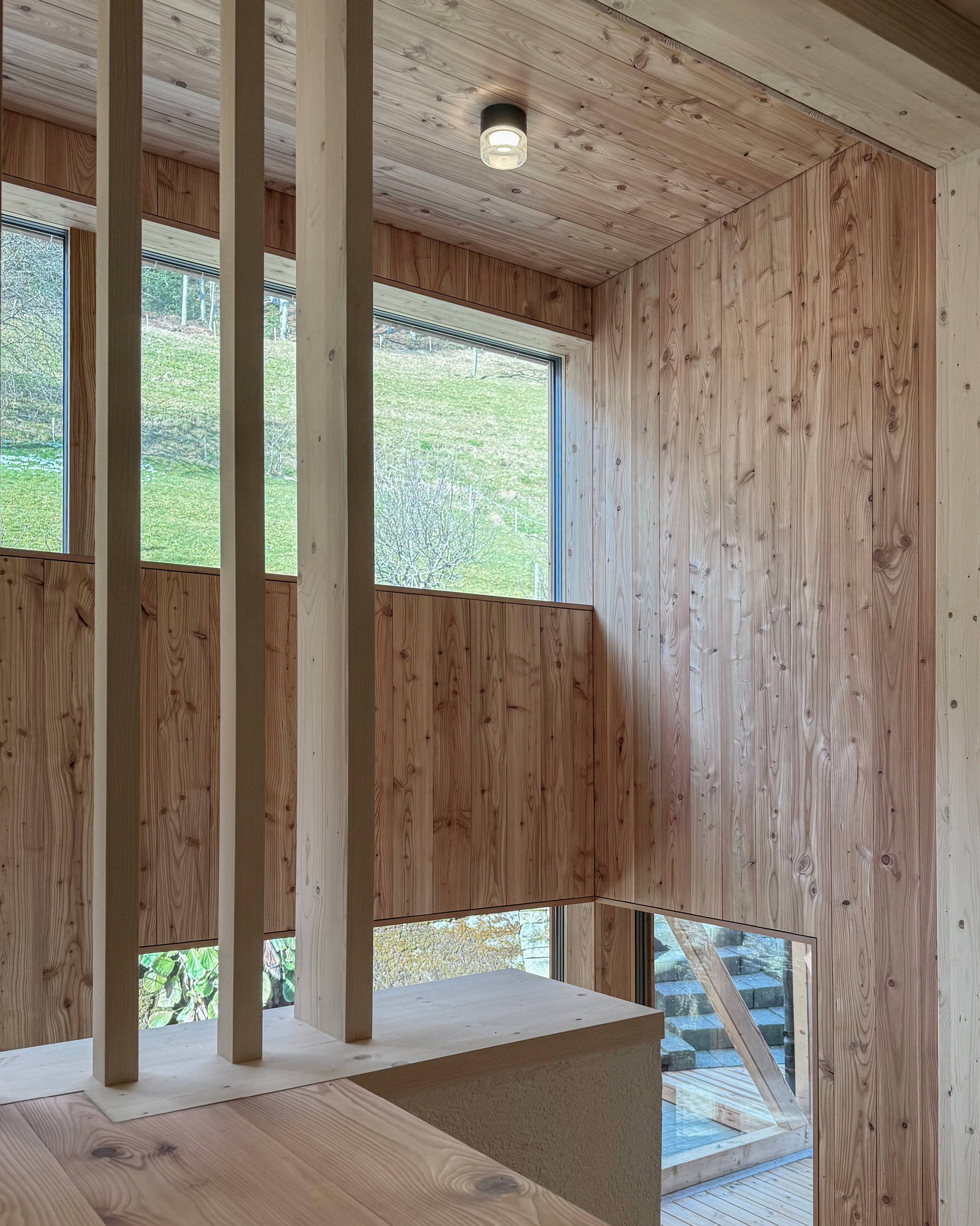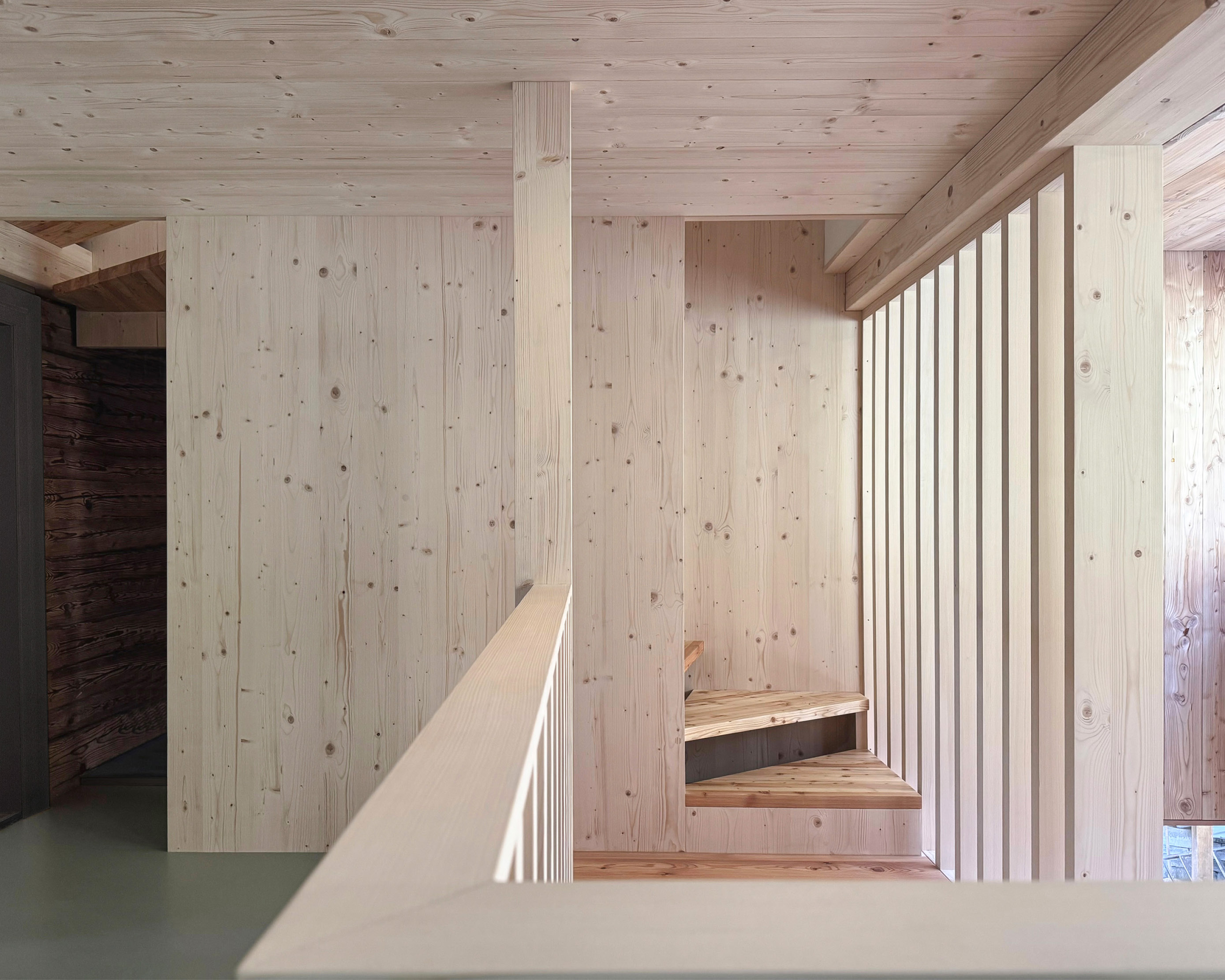 Als sich ein junges Paar mit zwei kleinen Kindern in ein altes Holzhaus in Grub SG verliebte und es kaufte, wurde ihm schnell klar, dass der hintere, bergseitige Hausteil deutlich mehr Potenzial hat, als es die bestehende, verschachtelte Struktur zulässt. Im Verlauf der vergangenen Jahrzehnte wurde die ursprüngliche Strickbaukonstruktion mehrfach umgebaut und teilweise ersetzt – oft ohne Rücksicht auf die ursprüngliche Baulogik. Eine grob ausgeführte Betontreppe verband die Geschosse, zudem wurde jedes Stockwerk als eigene Wohneinheit genutzt. P+S wollten das Haus wieder als Ganzes erleben und den vernachlässigten Hausteil stärker mit dem Hanggarten verbinden. Gesucht war eine grosszügige, zusammenhängende Struktur – innen wie aussen –, die ihrem Familienleben entspricht.