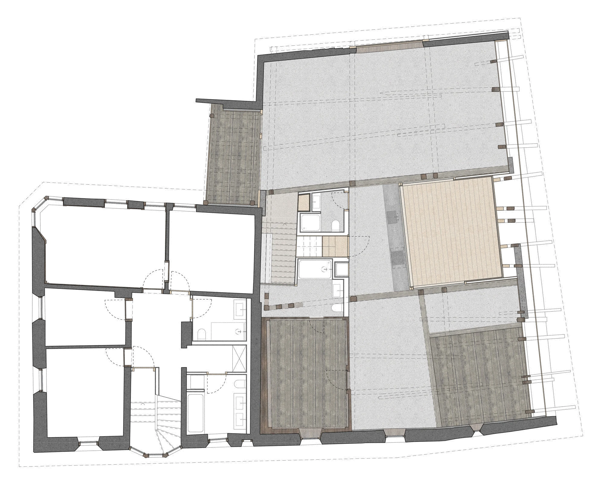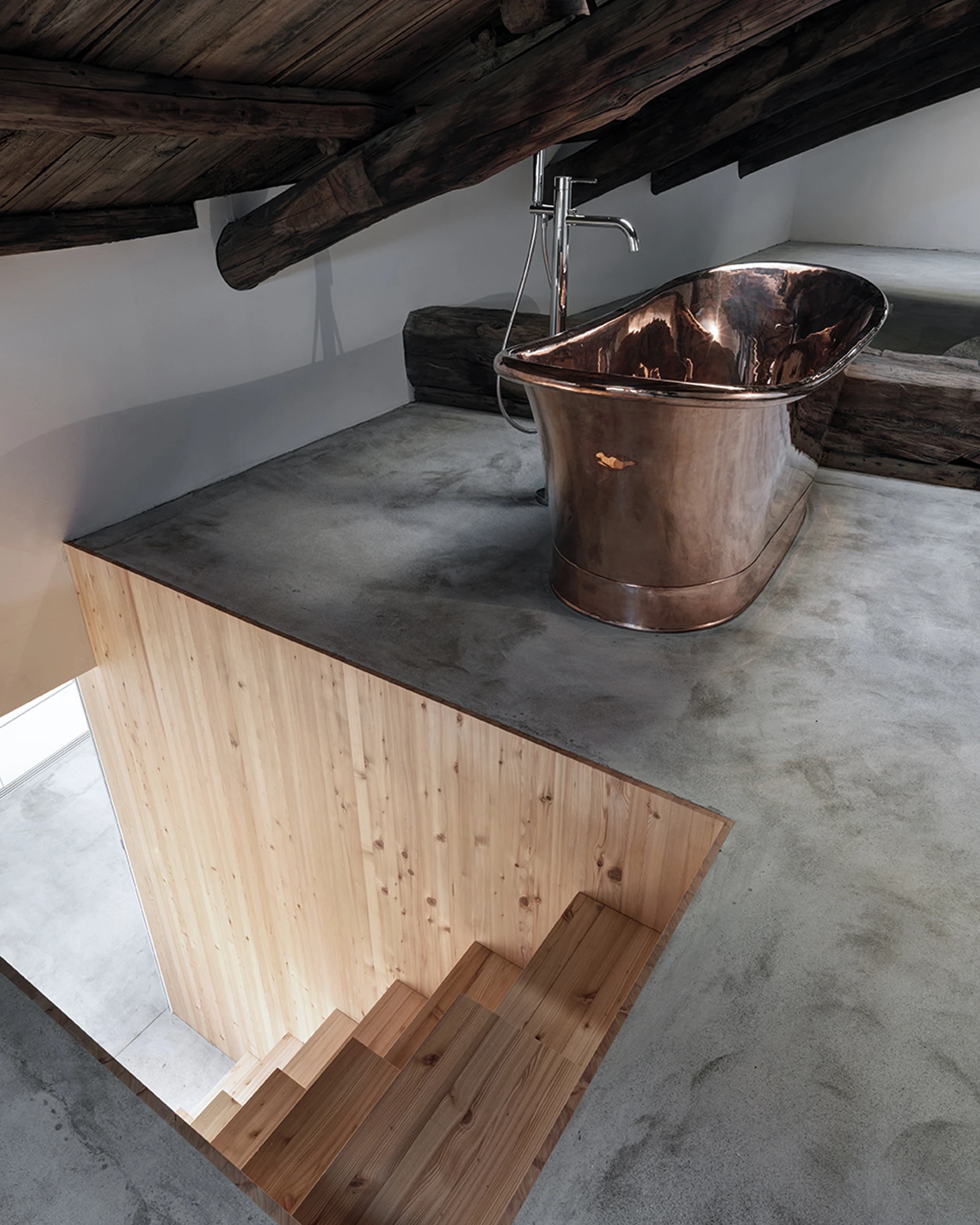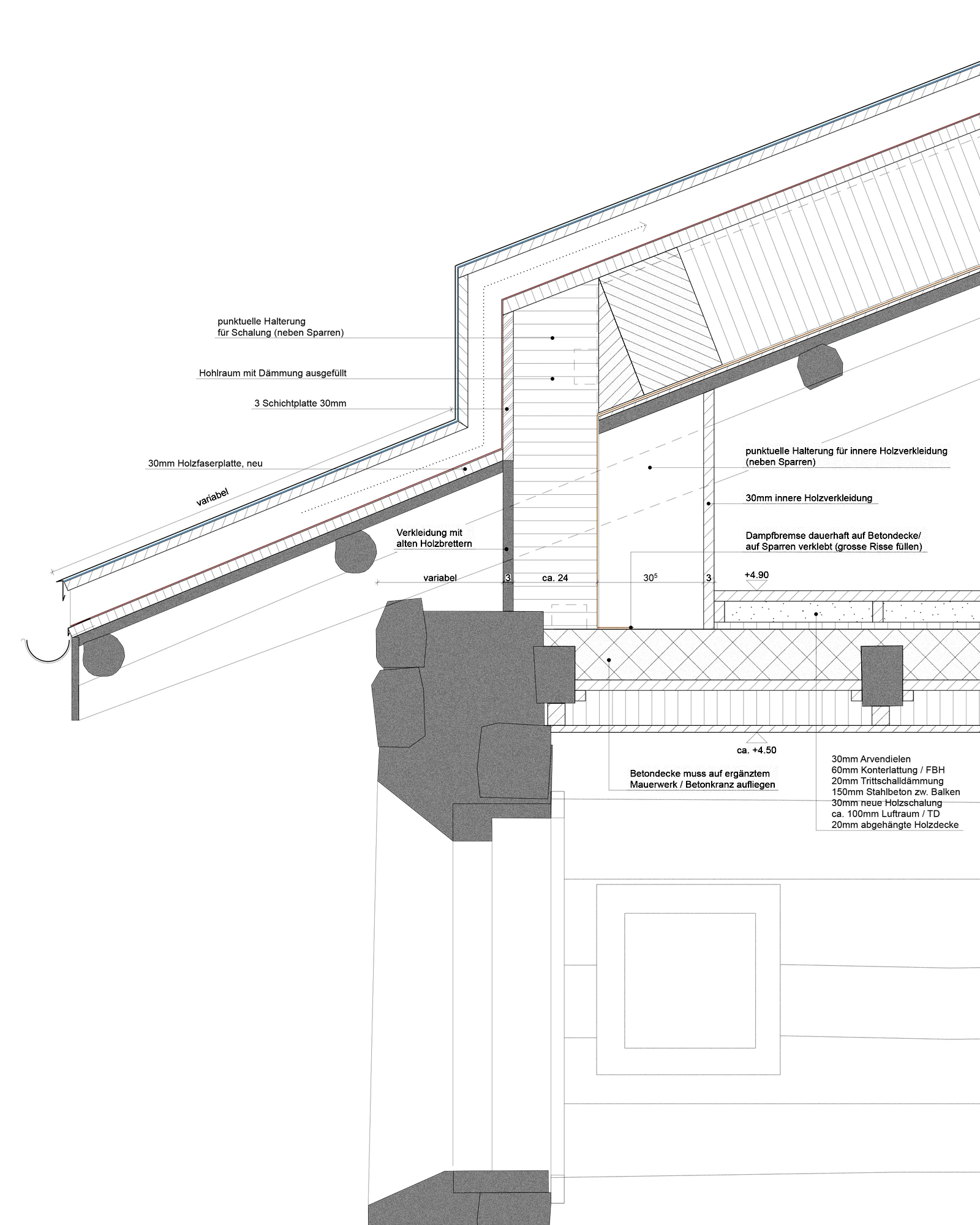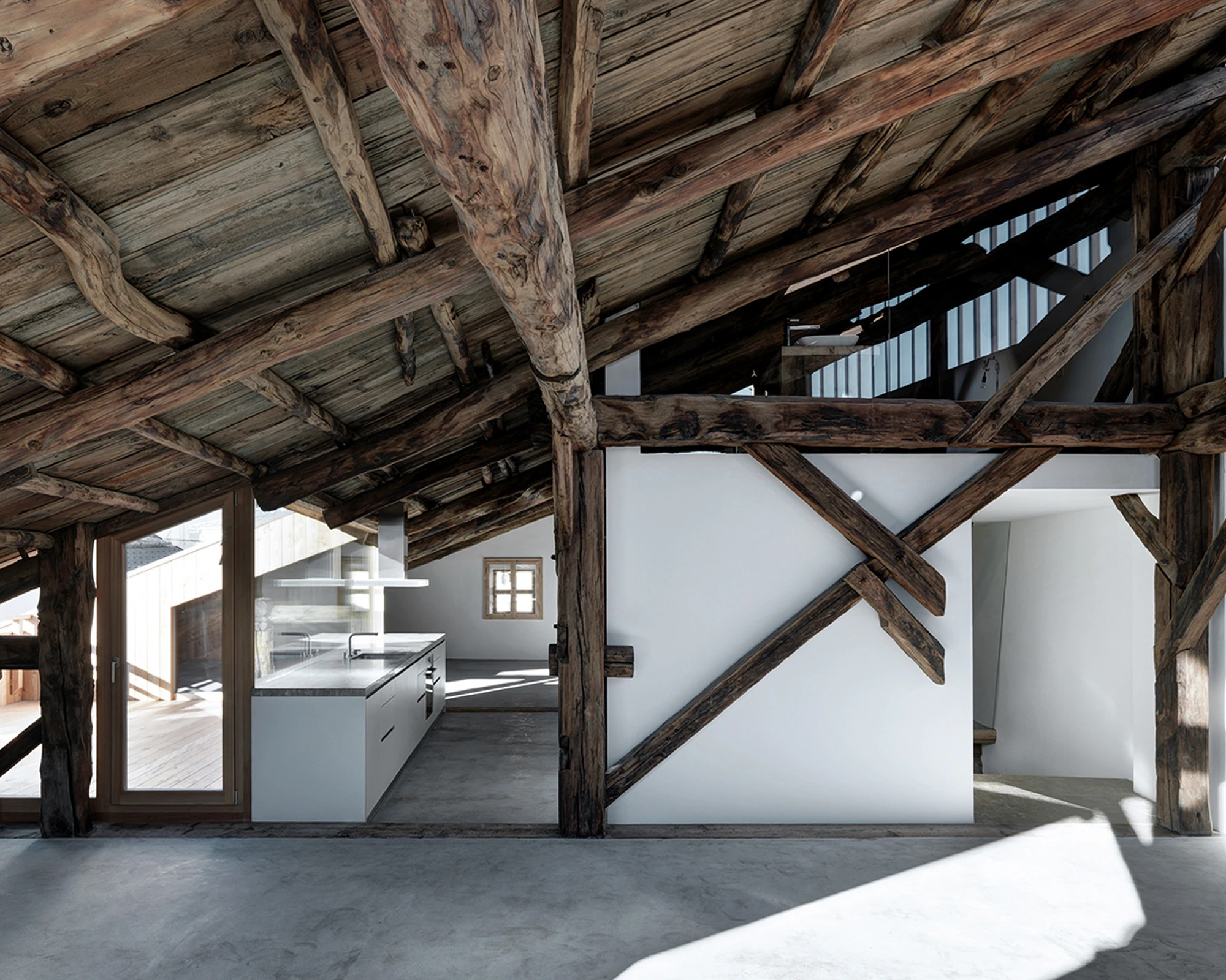 Um die ursprüngliche, starke Atmosphäre der Konstruktion zu erhalten, mussten wir eine zweite, verdeckte Tragkonstruktion über dem bestehenden Dachstuhl errichten. Die ursprüngliche Konstruktion blieb selbsttragend und in ihrer Form präsent, während wir in den frei gewordenen Zwischen- und Hohlräumen Platz für die notwendigen Funktionen einer modernen 3,5-Zimmer-Wohnung mit Dachterrasse schufen.