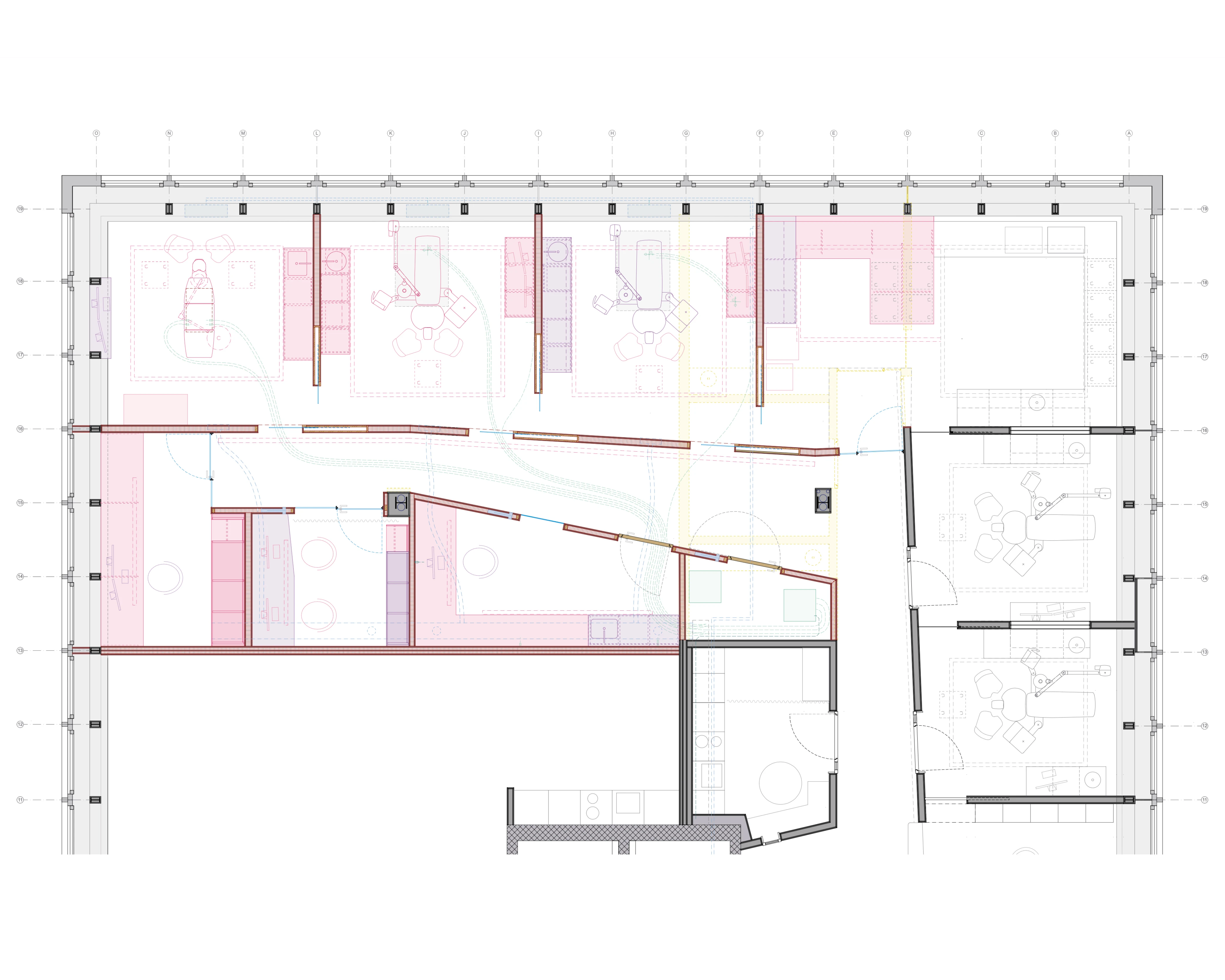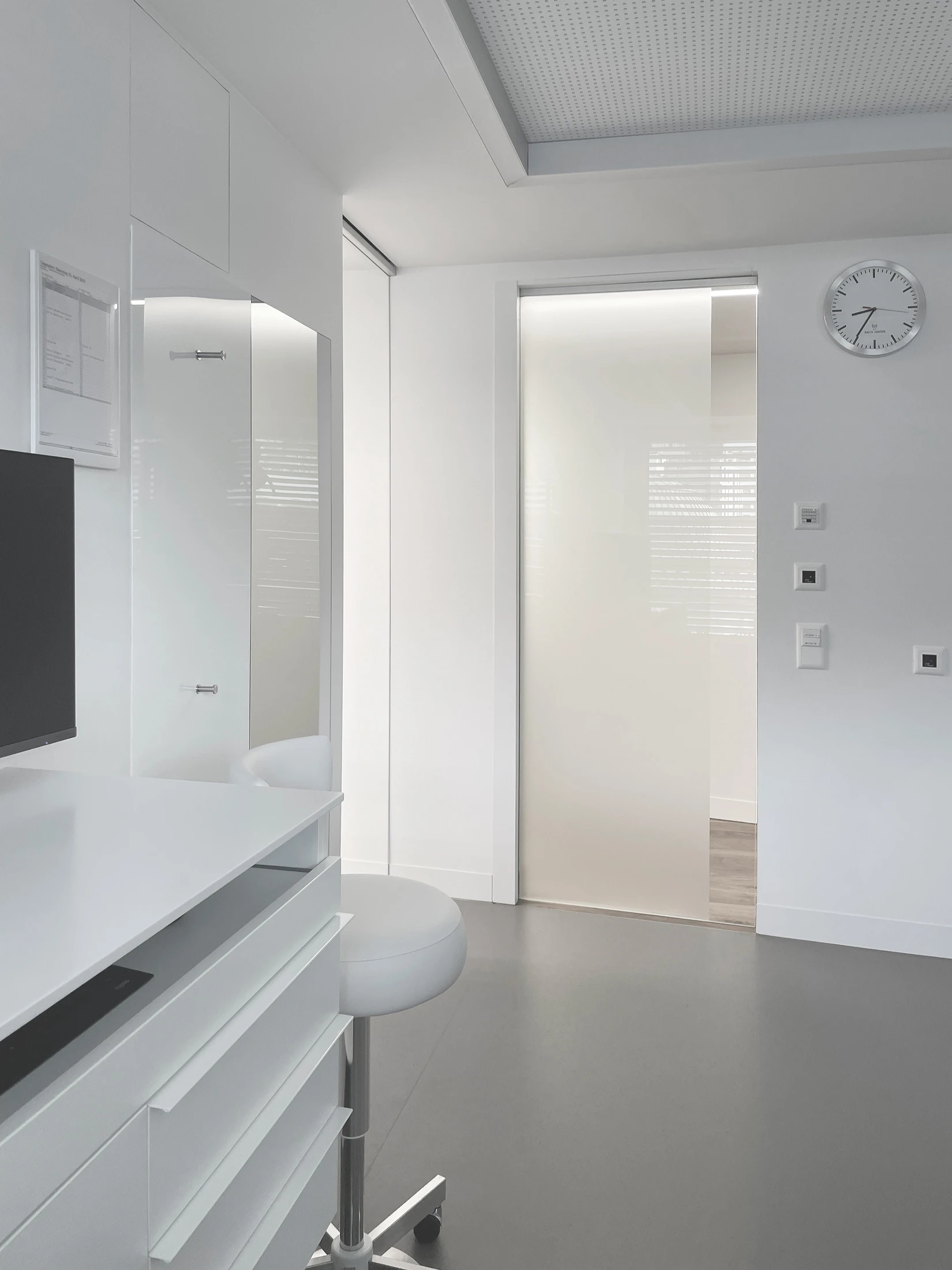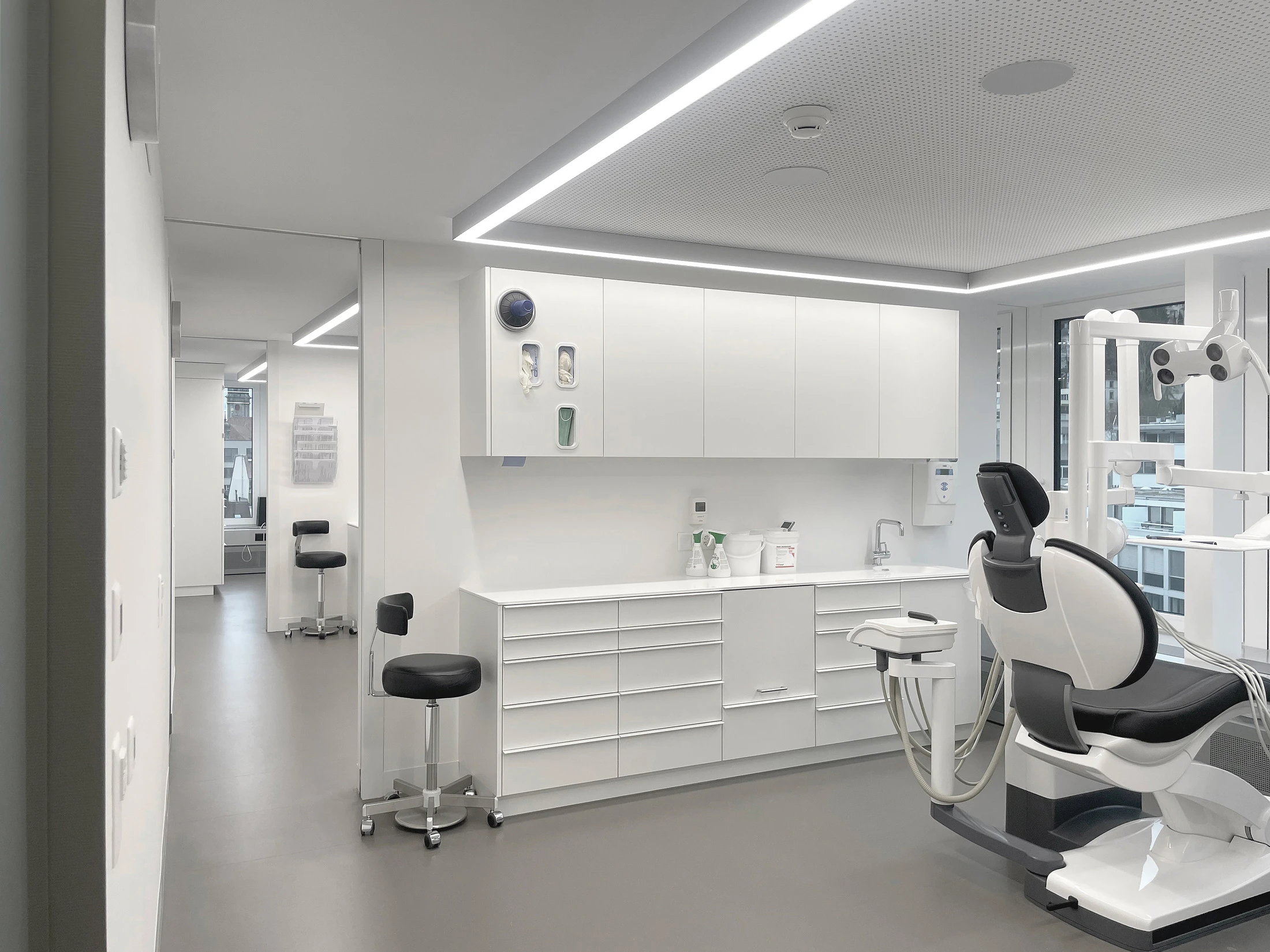 2017/18 plante und erweiterte das Büro Jeanette Geissmann Architektur die Arztpraxis Thun & Zahnmedizin Roza. Aufgrund der hohen Patientenzahl und um gleichzeitig das Ärzteteam erweitern zu können, entschied sich Dr. Roza für eine Erweiterung der gemieteten Räumlichkeiten. Ab April 2023 wird die Praxis ihre Patientinnen und Patienten in drei neuen Behandlungszimmern betreuen und mehr Platz für die Arbeit des Praxisteams bieten: neues Büro, Labor, Steri, Technikraum. Dr. Rozas Wunsch war es, möglichst viele Möbel aus dem abgebrochenen alten Praxisteil in die neu geplanten Räume zu integrieren.