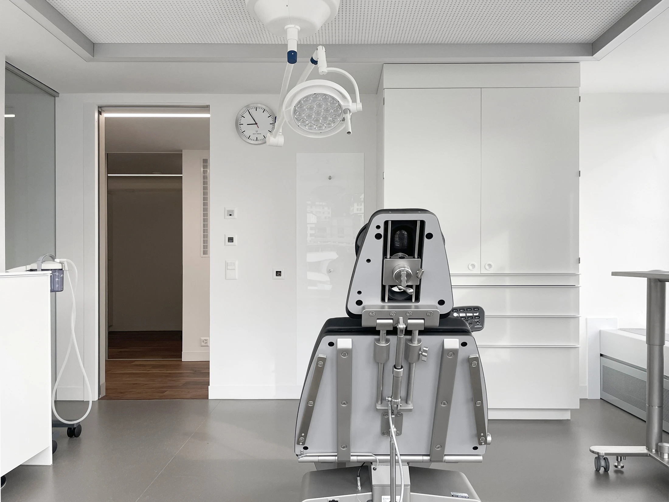 Die vorhandene Raumstruktur lässt sich gut erweitern. Die vom orthogonalen Gebäuderaster abweichenden Flurwände erzeugen eine subtile Dynamik: Auf dem Weg zu den Behandlungsräumen fühlt man sich eingeladen und nimmt unbewusst das Wechselspiel von weiten und engen Raumsituationen wahr. Mit den dunklen Wandflächen wirkt diese Raumfolge wie eine abstrahierte Höhle, hinter deren Öffnungen mit Glasschiebetüren der lichtdurchflutete Technikbereich der Zahnmedizin zum Eintreten lockt. Die Behandlungszimmer sind nach dem Stützenraster des Bürogebäude zugeschnitten und sind mit einem versteckten Sterilkorridor miteinander verbunden. Dieser Korridor, der der leichten Abwinklung des Flurs folgt, ist das architektonische Herzstück des Bauwerks.